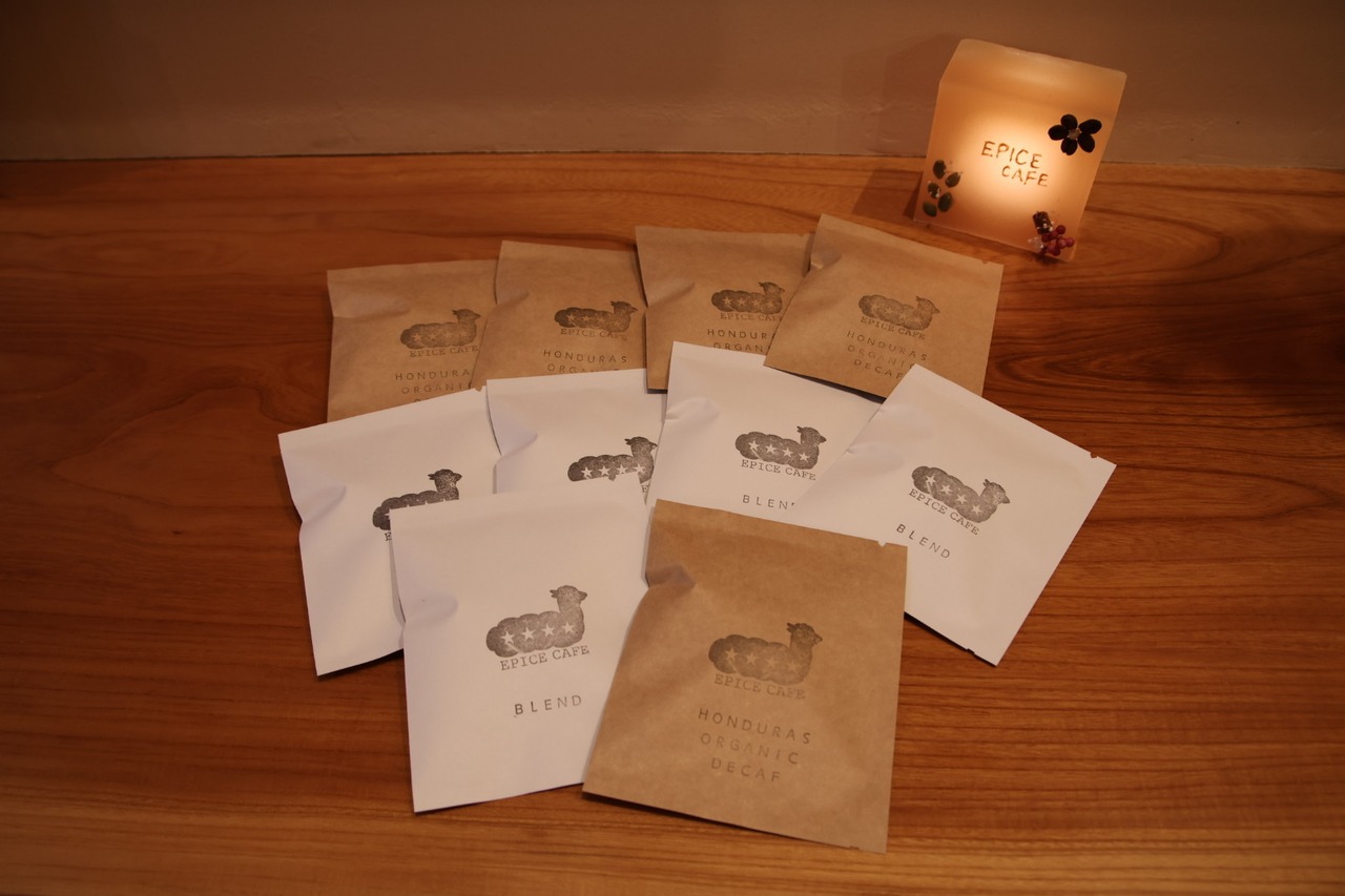 テトラ型ダンク式コーヒーバッグ10個(EPICEブレンド5個、ディカフェ5個)のセットになります。